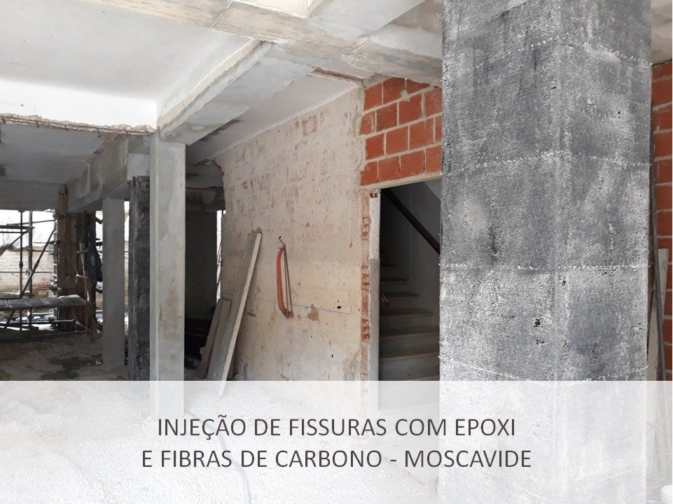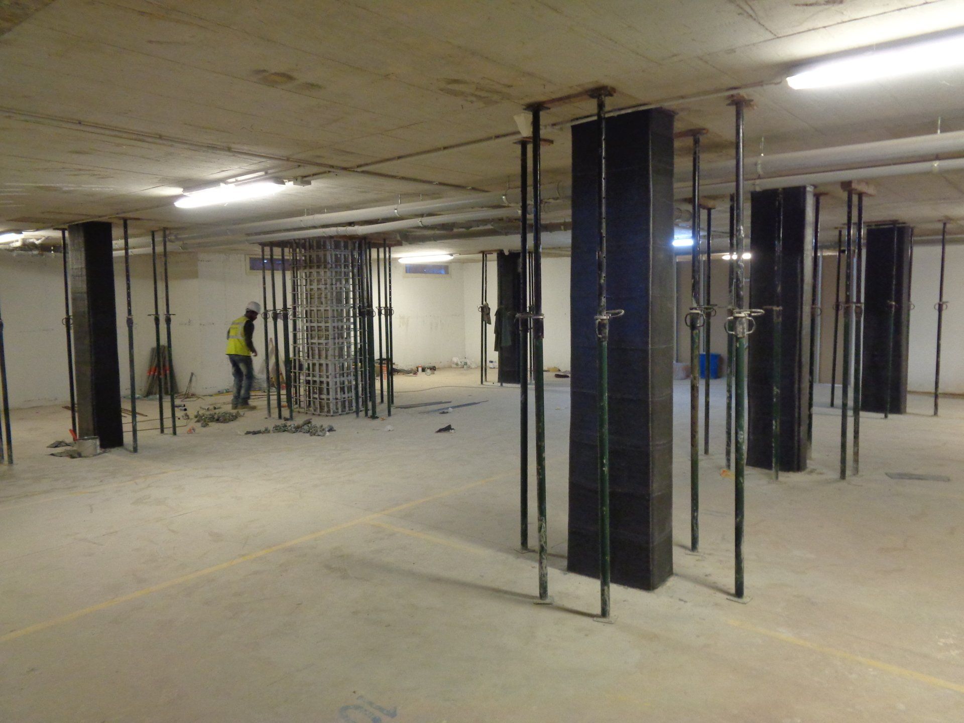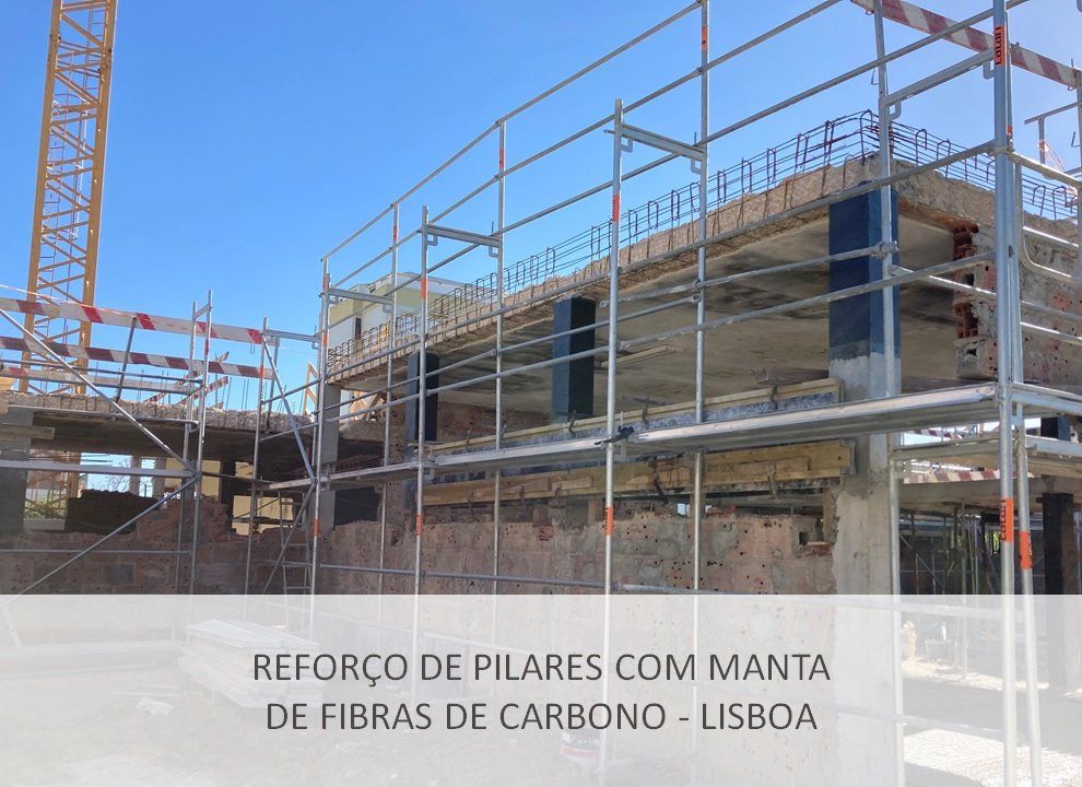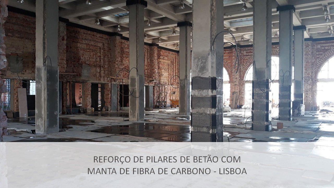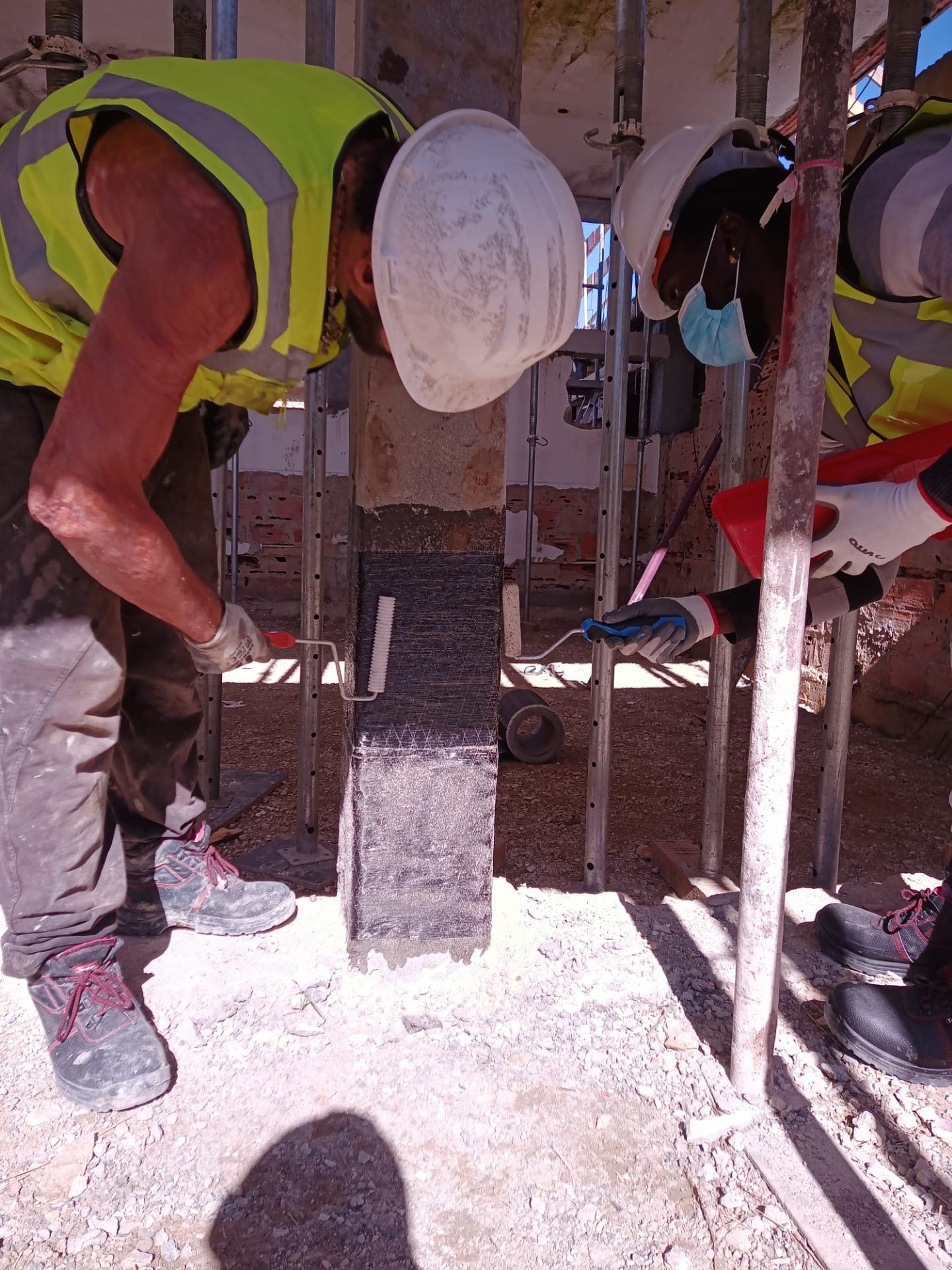 Segunda fase do reforço estrutural de pilares com mantas de fibras de carbono na Escola Básica Teixeira de Pascoais em Lisboa.